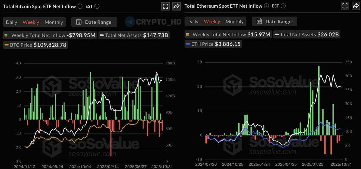 🧐 SV: Чистые притоки / оттоки средств в спотовых ETF за прошлую неделю. ⊹ Bitcoin ETF (#BTC) = -$798,950,000. ⊹ Ethereum ETF (#ETH) = +$15,960,000. ⊹ Solana ETF (#SOL) = +$199,210,000. ⊹ Hedera ETF (HBAR) = +$44,390,000. ⊹ Litecoin ETF (#LTC) = +$719,970. Crypto Headlines