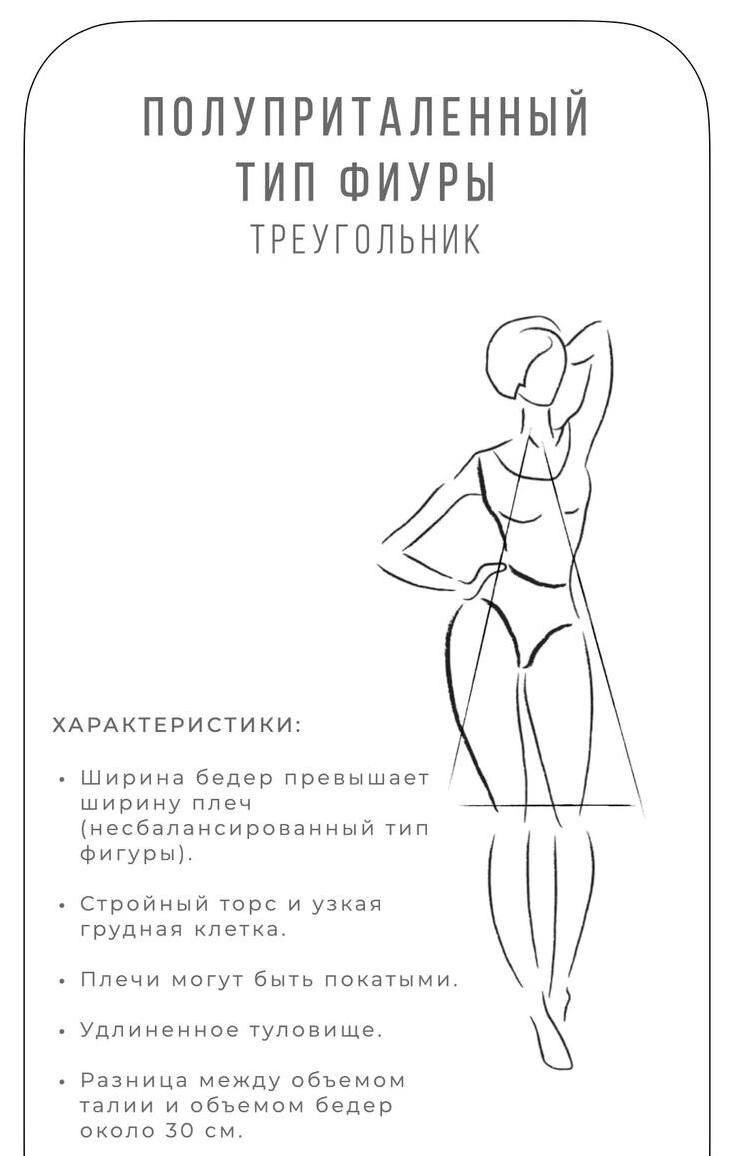 Советы по выбору одежды: 🔺Типаж «груша»/«треугольник»: ▪️Брюки: 1. Прямые или слегка расклешенные: Они помогут сбалансировать пропорции и визуально удлинить ноги. 2. Брюки с высокой талией: Это подчеркнет талию и сделает силуэт более стройным. 3. Темные цвета: Выбирайте темные оттенки для брюк, чтобы визуально сузить бедра. 4. Декор на карманах: Избегайте объемных карманов, но небольшие детали могут добавить интерес к образу. ▪️Юбки: 1. А-силуэт: Юбки, которые расширяются от талии, отлично подойдут для типа «груша». Они скрывают бедра и акцентируют внимание на талии. 2. Юбки-макси: Длинные юбки могут быть очень стильными и комфортными, при этом они создают плавный силуэт. 3. Плиссированные юбки: Они добавляют объема внизу и хорошо скрывают ширину бедер. 4. Трапеция: Такие юбки также подчеркивают талию и создают гармоничный образ. ▪️Верх: 1. Объемные блузы и топы: Выбирайте модели с рукавами-фонариками или драпировками, чтобы создать баланс с нижней частью. 2. V-образный вырез: