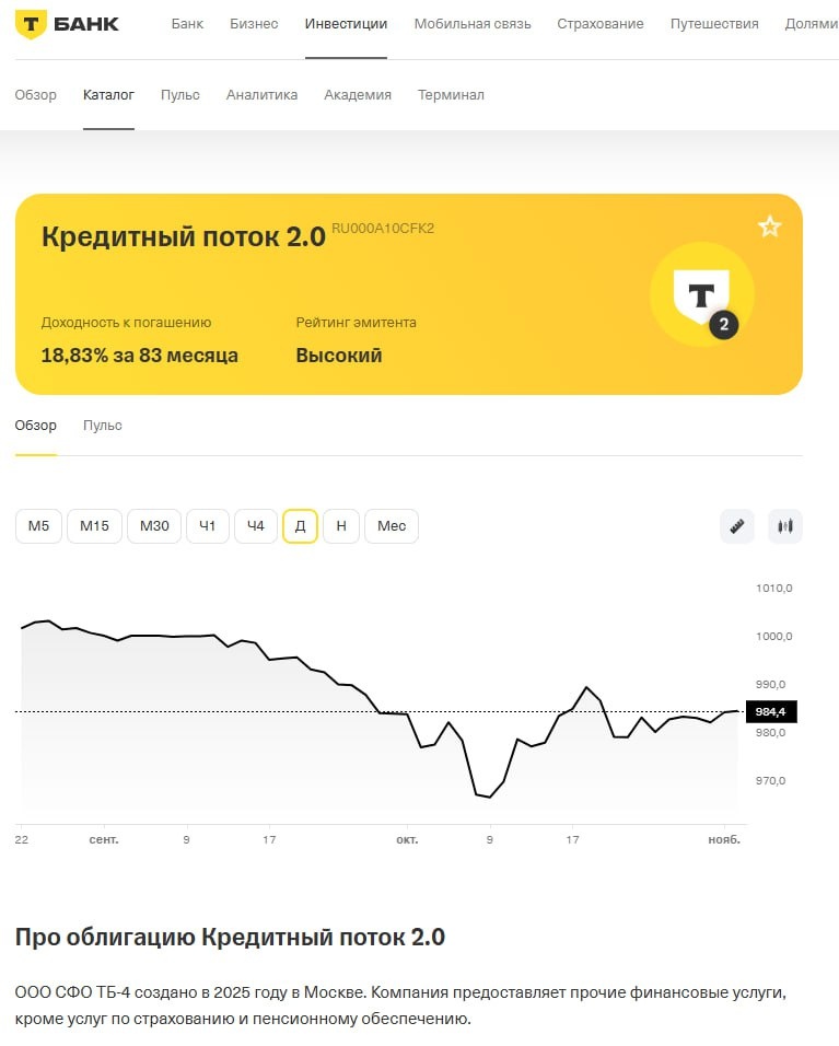 Меня вот все не отпускает "дикая популярность" облигаций с названием "Кредитный Поток", в которых прямым текстом говорится, что они обеспечены кредитами Т-Банка физлицам, говорится про какие-то высокие рейтинги эмитента и надежность. Мне вот лень было разбираться самому в этом и проводить глубокое расследование, читать все документы и я ждал, что кто-то из моих коллег сделает это. Но они "почему-то" говорят только о том, что "покупают это в свой портфель". Ок... Давайте я вам несколько моментов расскажу... За что вы получаете пару процентов сверх доходности ОФЗ? 1. Давайте разберемся что вы делаете, когда покупаете любые облигации? Вы ничего не покупаете. Вы даете в долг эмитенту. А та бумажка, которая у вас показывается в портфеле - это право требования долга. Простыми словами если. 2. Теперь давайте узнаем, а кому вы даете в долг, думая, что имеете дело с надежным Т-Банком?! Вы даете деньги в долг ООО, которое зарегистрировано в апреле 25 года и имеет уставный капитал 10 тр, а юр