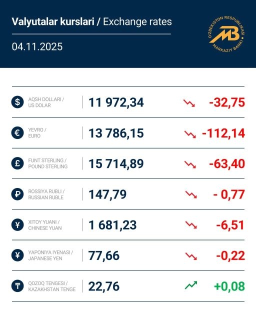 Согласно данным регулятора, доллар США подешевел на 32,75 сум и составил 11 972,34 сумов. Евро показал наиболее резкое падение, потеряв 112,14 сум, установившись на уровне 13 786,15 сумов. Следом за ними существенное снижение продемонстрировал фунт стерлинг, курс которого снизился на 63,40 сум, остановившись на отметке 15 714,89 сумов.