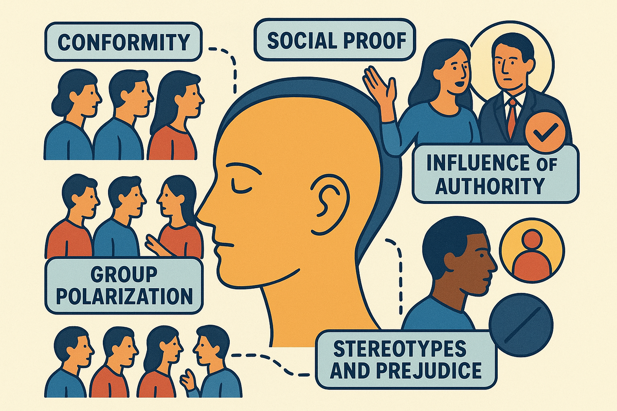 # Социальная психология: как социум формирует наше восприятие и поведение Каждый человек — часть общества, и наше восприятие мира не формируется в вакууме. Социальная психология изучает, как присутствие других людей, социальные нормы и ожидания влияют на мысли, чувства и поведение индивида. Этот процесс настолько тонок, что мы часто даже не осознаём, как сильно общество влияет на наше восприятие реальности. ## Влияние группы на индивидуальное восприятие Одним из ключевых принципов социальной психологии является **конформизм** — склонность подстраиваться под мнение или поведение группы. Исследования Соломона Ашера показали, что даже очевидно неверные решения большинства могут заставить человека сомневаться в собственных ощущениях и принять чужое мнение. Это демонстрирует, насколько сила группы способна изменить восприятие. ## Социальное доказательство и ориентиры поведения Люди часто ориентируются на действия и мнение окружающих — это принцип **социального доказательства**. Если б