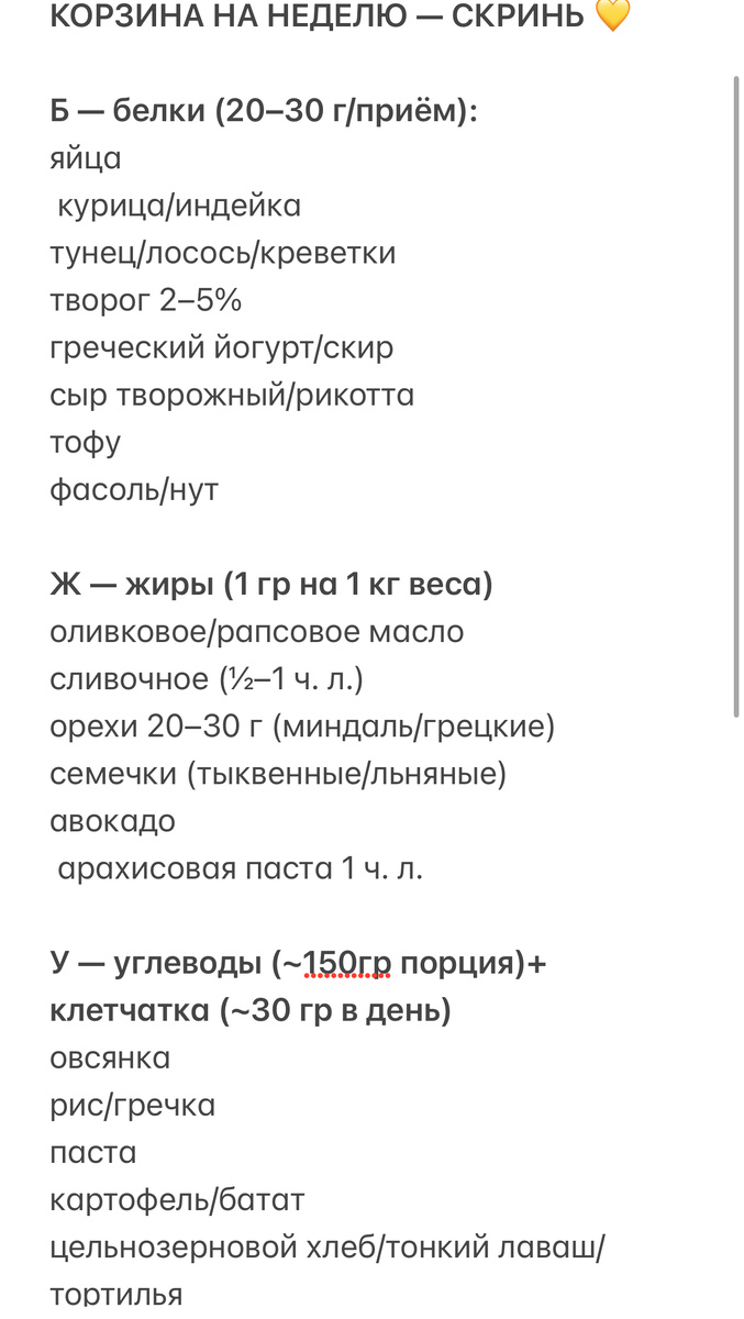 Когда питание «по настроению» — чаще случаются пропуски днём и переедания вечером, лишние траты и тревога «что съесть?». Мини-план снижает усталость от решений, держит дефицит и баланс БЖУ🤓 Как планировать за 10 минут в неделю? 1. Выберите 3–4 базовых завтрака/обеда/ужина — «скелет» вашего плана. 2. Соберите корзину по Б/Ж/У + маленькие вкусняшки после еды. 3. Ужины по схеме 3–2–1: ½ овощи, ладонь белка, ¼ гарнир, 1 ч. л. масла. 4. Держите перекусы на форс - мажор: скир, яйца, тунец, рис в пакетиках, салат-микс, лаваш. Главный принцип корзины: отталкиваемся от Б/Ж/У — в рационе должны быть белки + жиры + углеводы каждый день. Белки (сытость и форма): яйца, курица/рыба, йогурт/скир, творог, тофу. Жиры (вкус и витамины): оливковое/рапсовое масло, сливочное ½–1 ч. л., орехи/семечки, авокадо. Углеводы (энергия): овсянка, рис/гречка, паста al dente, картофель, фрукты, овощи. А сколько у вас уходит времени на планирование приемов пищи?