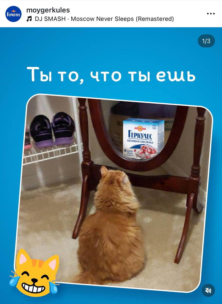 Например, Геркулес вместо традиционной рекламы о пользе овсянки использует в своих соцсетях ситуативные мемы с котиками, вирусные тренды и ироничные подписи. Они не просто продают крупу, а встраиваются в культурный код аудитории, превращая обычный завтрак в повод для шутки.