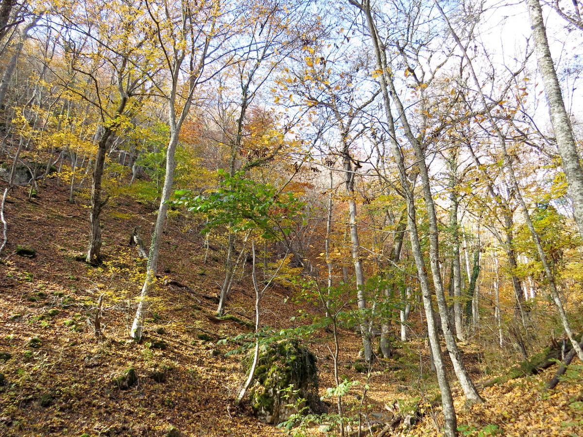 Почему все пишут про осень грустно? Нам не грустно гулять по такому красивому лесу! И он ни капельки не увядающий! Он красив и наряден! И нет ни какого сожаления об ушедшем лете. Оно у нас слишком жаркое, слишком сухое. Вот уже и прошли сказочное, заросшее папоротником ущелье. Оно одно такое здесь! Почему именно здесь растет папоротник? Почему его нет на других замшелых камнях? И снова солнечный луч скользнул по листве. И снова все засияло вокруг золотом! Решили остановиться в этом месте на привал. Сидели почти час! Если бы прохлада не начала пробираться по спине, то сидели бы еще, не замечая время. Пока сидели и рассматривали все вокруг, на противоположном склоне увидели просто заросли вот таких грибов! Учитывая, что ни я, ни Светлана их не знаем, то ограничились только фотографиями. Яндекс убеждает, что это Опенок осенний. Но, я в опятах совсем не разбираюсь. Однако, если он съедобный, то можно было в этом месте набрать 10 ведер, если не больше. Весь склон, усыпанный трухой от