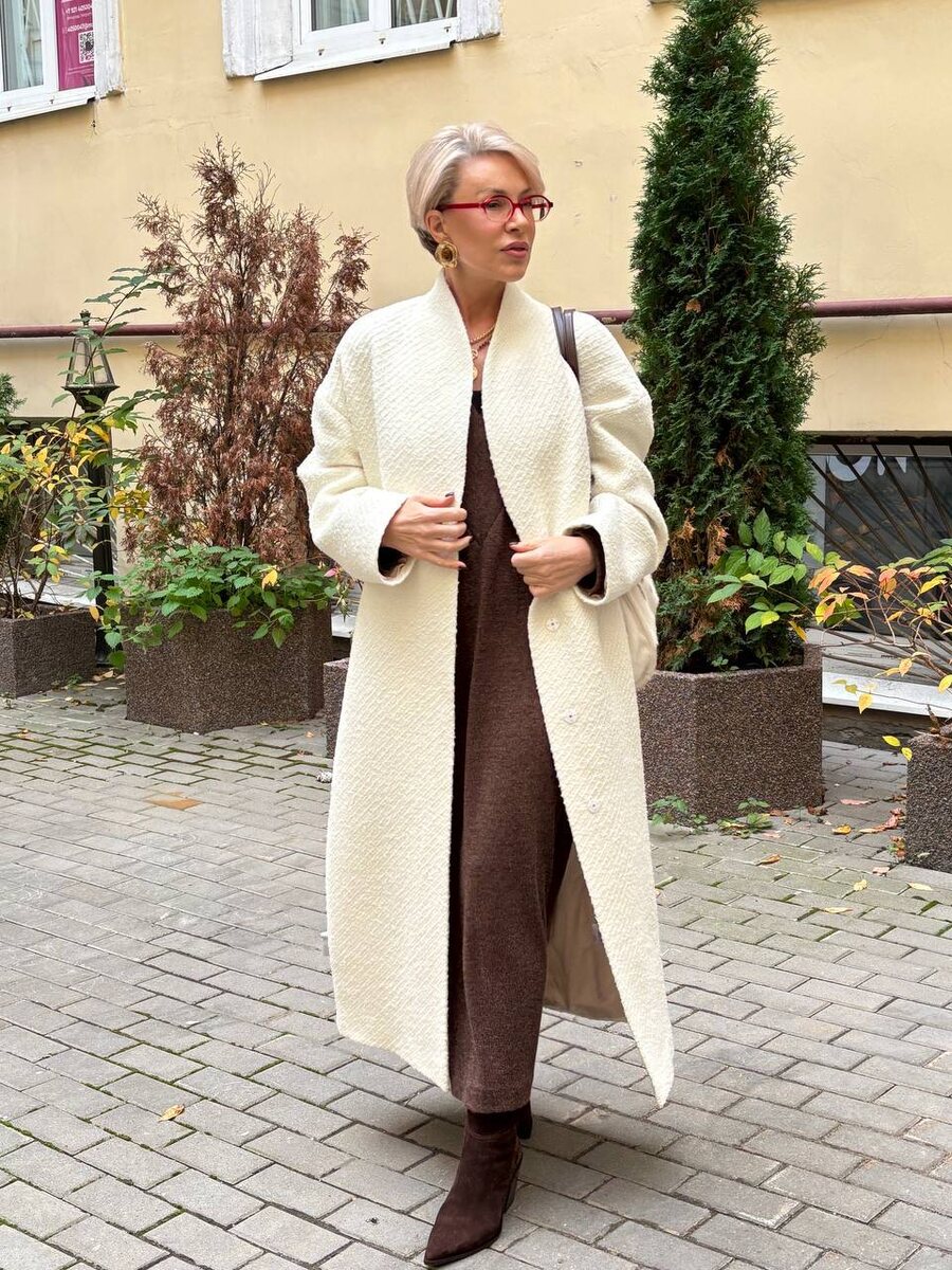 Здравствуйте, дорогие читатели! Недавно я в очередной раз зашла в магазин бренда Anna Pekun, чтобы показать вам новинки и всё примерить. Большое подробное видео с обзорами новинок от моих любимых брендов скоро будет доступно для Премиум-подписчиков 3-го уровня. Основное внимание я уделила, конечно же, верхней одежде. Не забывайте ставить лайк за мои старания! Начну со своих покупок... Моё новое молочное пальто-кокон из текущей коллекции. Сшито из уютной ткани букле с содержанием шерсти 30%. Отличная длина миди смотрится очень стильно. Такое пальто украсит практически любой образ. Ссылка на пальто Понравился этот трикотажный костюм — юбка и кардиган. Доступен в двух цветах: серо-голубом и белом. Я сразу собрала с ним готовый образ: дополнила костюм молочной водолазкой из мериноса, тоже от этого бренда. Получилось очень стильно, тепло и комфортно. Добавила шарф — в таком наряде можно ходить еще долго. А за счет раздельного верха и низа комплект становится по-настоящему вариативным. Ссылк
