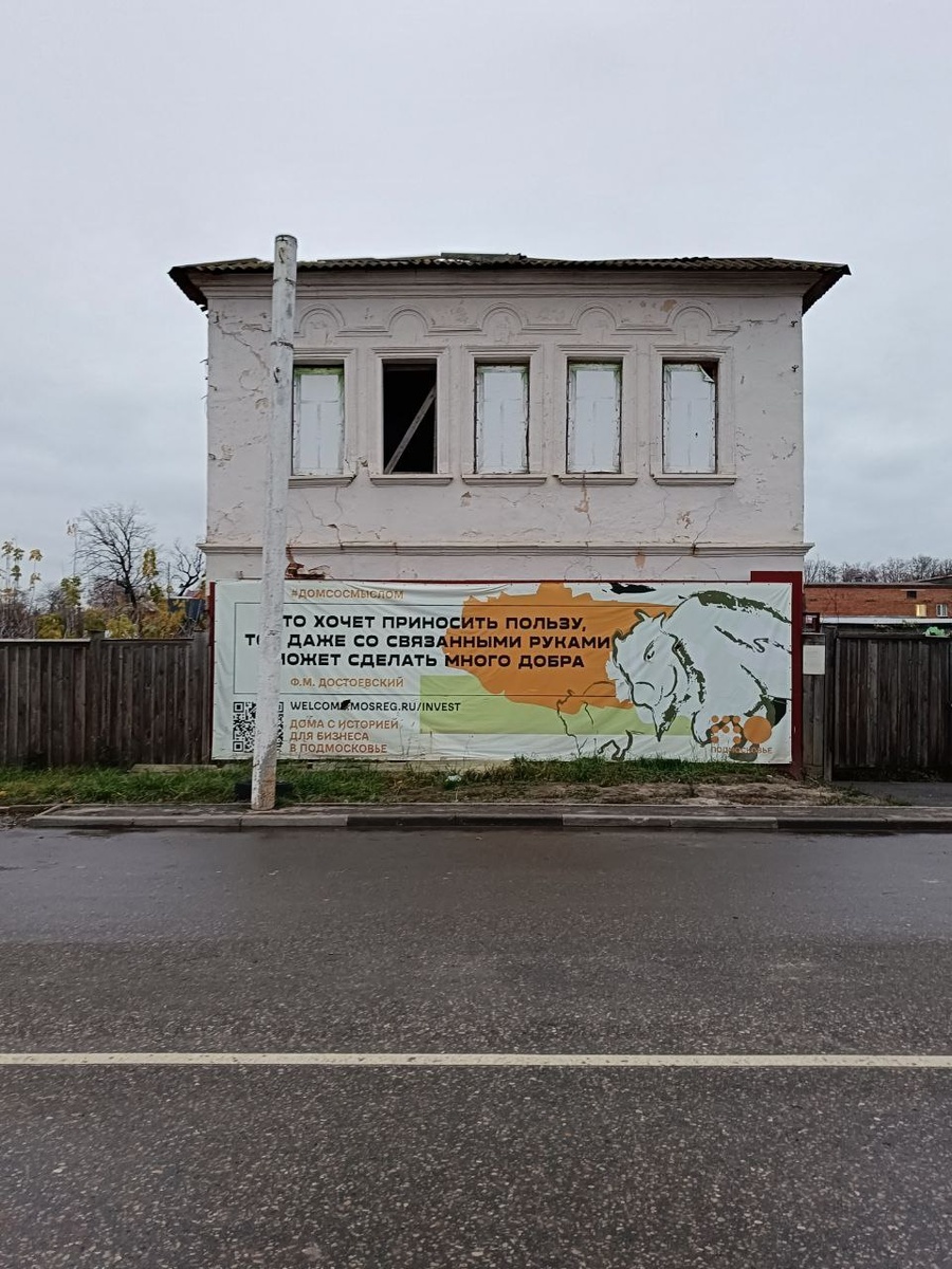 Фото дня из Зарайска Это программа поддержки бизнеса себя рекламирует, нравоучениями от Достоевского. Отдельно доставляет хештег «домсосмыслом», на доме, который разваливается пополам.