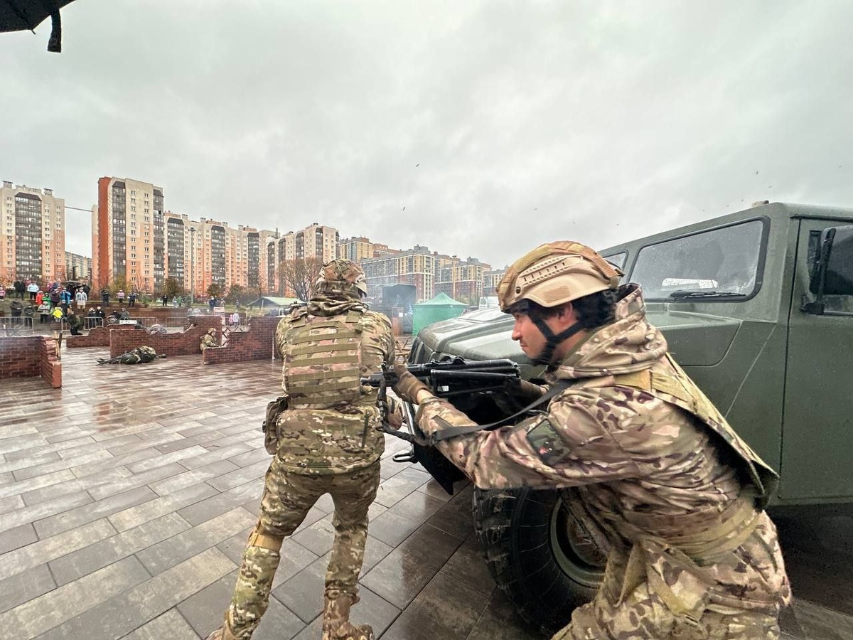 Российский спецназ успешно обезвредил «террористов» в парке Кудрово в рамках показательной реконструкции, посвящённой Дню народного единства В точном соответствии с существующими у военных алгоритмами в зоне амфитеатра прошли несколько «сражений». При этом максимально точно были воссозданы образы «своих» и «чужих»: одежда, экипировка, оружие. Развернувшаяся на глазах зрителей картина оказалось поистине впечатляющей: хлопки выстрелов, отскакивающие во все стороны гильзы создали полное погружение в инсценируемую ситуацию. Ребята получали настоящие боевые приказы по самым настоящим рабочим рациям. После локального захвата боевиков посетителям продемонстрировали, как работает снайпер, а затем перешли к «густой боёвке». Жителям молодого города показали обычный российский блокпост в зоне ведения боевых действий. Здесь ребята отдают свой долг Отечеству, регулярно отбивают атаки дронов, противостоят нападениям врага. Пост был взят неприятелем, двое наших бойцов попали в плен. Введён режим ко
