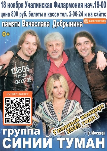 Памяти Маэстро Вячеслава Добрынина. Совсем скоро в нашем городе ВПЕРВЫЕ (!) состоится концерт легендарного московского ансамбля «СИНИЙ ТУМАН». В составе группы «СИНИЙ ТУМАН» артисты, много лет выступавшие в музыкальном коллективе Вячеслава Добрынина. Совсем недавно Маэстро ушел от нас. Но остались его замечательные песни. И приятно, что у почитателей его таланта, и особенно у женщин, есть возможность насладиться творчеством самого женского композитора нашей эстрады в исполнении группы «СИНИЙ ТУМАН»! Концерт посвящен памяти Вячеслава Добрынина. Но пускай эта грусть будет светлой! Пусть в ваших сердцах всегда «Льётся музыка»- такая любимая и почти родная, как «Родная земля». Артисты пообещали, что не будут вам сыпать «Соль на рану», но обязательно угостят вас «Ягодой-малиной», вы с головой окунётесь в «Синий туман» и обязательно покатаетесь «На теплоходе», где музыка играет. Ну а в финале концерта все вместе скажем: «Прощай!», но… https://uchaly102.ru/?p=109097