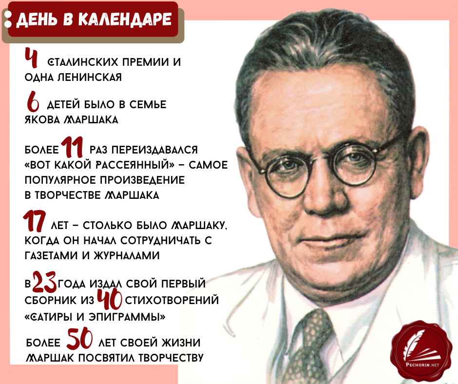 🗓️3 ноября в слободе Чижовка Воронежской области родился Самуил Яковлевич Маршак (1887-1964), автор известных произведений для детей, таких как «Кошкин дом» и «Двенадцать месяцев», которого смело можно назвать творцом детства. Отец Маршака, химик-технолог, часто менял место работы, что вынуждало семью переезжать. Самуил начал сочинять ещё до того, как научился писать, а в 6 лет уже писал на русском, идише и иврите. В гимназии он перевёл поэму Горация «В ком спасение». Когда семья переехала в Петербург, Самуил остался с младшим братом, чтобы избежать проблем из-за еврейского происхождения. В Петербурге он познакомился с критиком В.В. Стасовым, который ввёл его в мир русской культуры и помог перевестись в гимназию. М. Горький также сыграл важную роль в его судьбе, пригласив в Ялту для восстановления здоровья. В 1911 году он отправился в путешествие по Турции и Палестине, где познакомился с будущей женой Софьей Мильвидской. После свадьбы они уехали в Англию, где Самуил учился в Лондонс