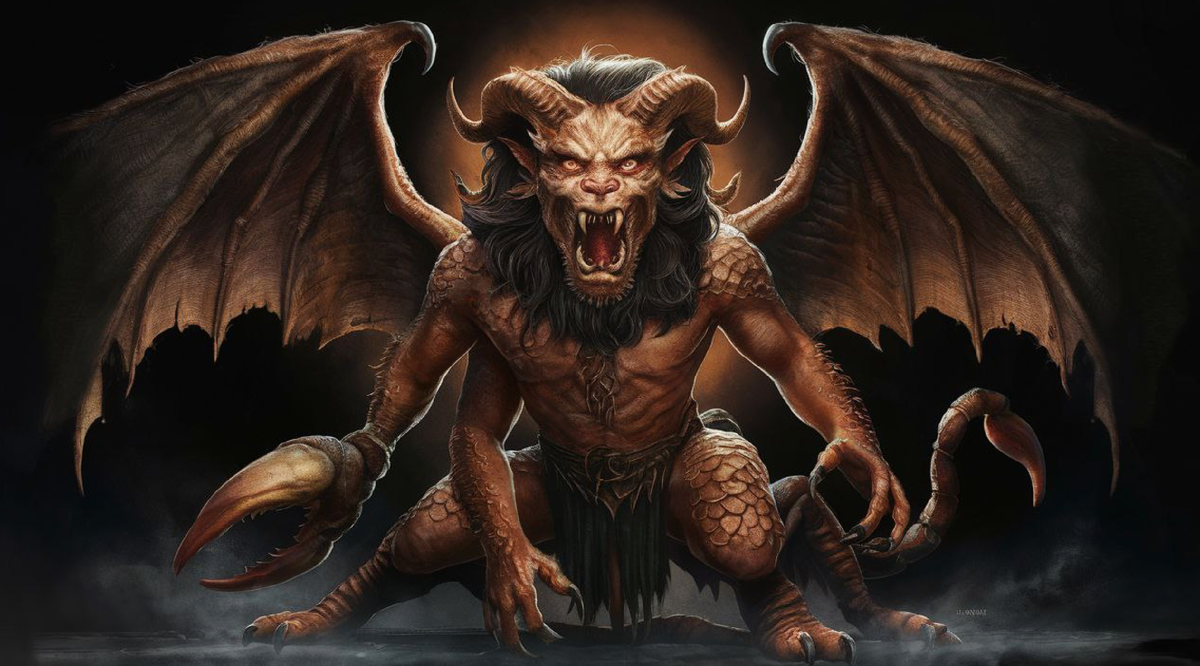 Вдалеке, мимо кареты двигалось существо, не похожее ни на что, что Семён видел раньше. Нечто шагало вдалеке от их транспорта. Огромное, высотой с торчащие из песка остовы разрушенных человеческих небоскрёбов. Ящероподобные лапы, заканчивающиеся заостренными когтями, били по земле, поднимая клубы пыли и десятки камней в воздух. Затем, лапы переходили в подобие конечностей, которые мы не раз видели у собак. Человеческий торс, покрытый полностью зелёной чешуёй, был обёрнут в пояс, повязанный на крепкое мускулистое тело. Некое подобие древнего хитона было обёрнуто вокруг талии. Такие же крепкие мускулистые человеческие руки исходили из плеч существа, а из пальцев торчали серповидные когти. Всё это заканчивалось смесью львиной головы с человеческими чертами, и огромными, казалось, идеально круглыми глазами. Взгляд существа был суровый, немигающий и, вроде бы, какой-то усталый. Голову обрамляла корона, что исчезала своим ободом, где-то в глубине локонов — подобии гривы, что была местами заплетена в косы. Из спины торчали крылья во весь рост исполинского создания, покрытые огромными перьями. Перья, что переливались на солнечном свете, были преимущественно сине-зелёного оттенка. За самим существом по земле безвольно тянулся хвост скорпиона.