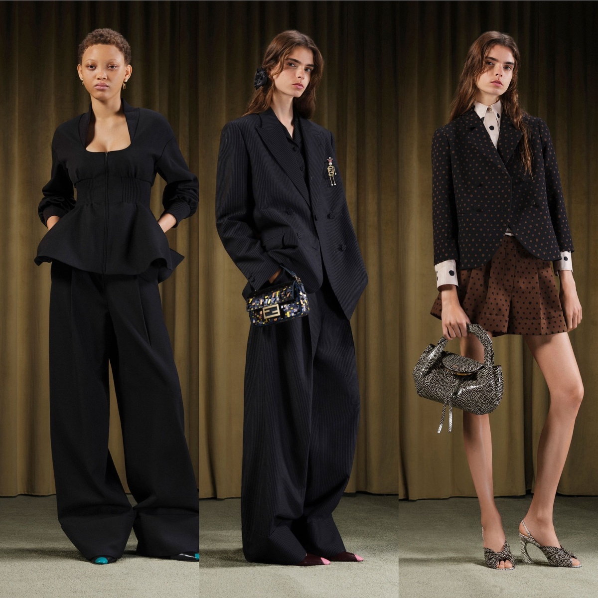 Новая коллекция FENDI Resort 2026 вдохновлена старой фотографией, где Сильвия Вентурини Фенди стоит рядом с Карлом Лагерфельдом. Она в платье, будто сошедшем со страниц эпохи диско в монохромный горошек с игривой баской с рюшами. Тот самый наряд, в котором она блистала в культовых ночных клубах… Из винтажного узора в горошек и родилась эта коллекция, на грани реальности и фантазии. Горошек превращается в абстрактный принт, шепчущий о ночных бабочках, о трепете крыльев в лунном свете. «Художественный, живописный, анималистичный. - говорит Сильвия. - Точки расположены неравномерно, потому что я думала о мотыльках — ночных животных, которые оживают ночью и тянутся к свету». Мотив мотылька расцвёл в коллекции во всём многообразии: в изысканной интарсии на овчине, в динамичных принтах на рубашках со сборками, в плиссированных юбках, где каждая складка повторяет полёт бабочки, в вечерних платьях с пайетками, мерцающих, как крылья в свете софитов. Работа с мехом потрясает! Аксес