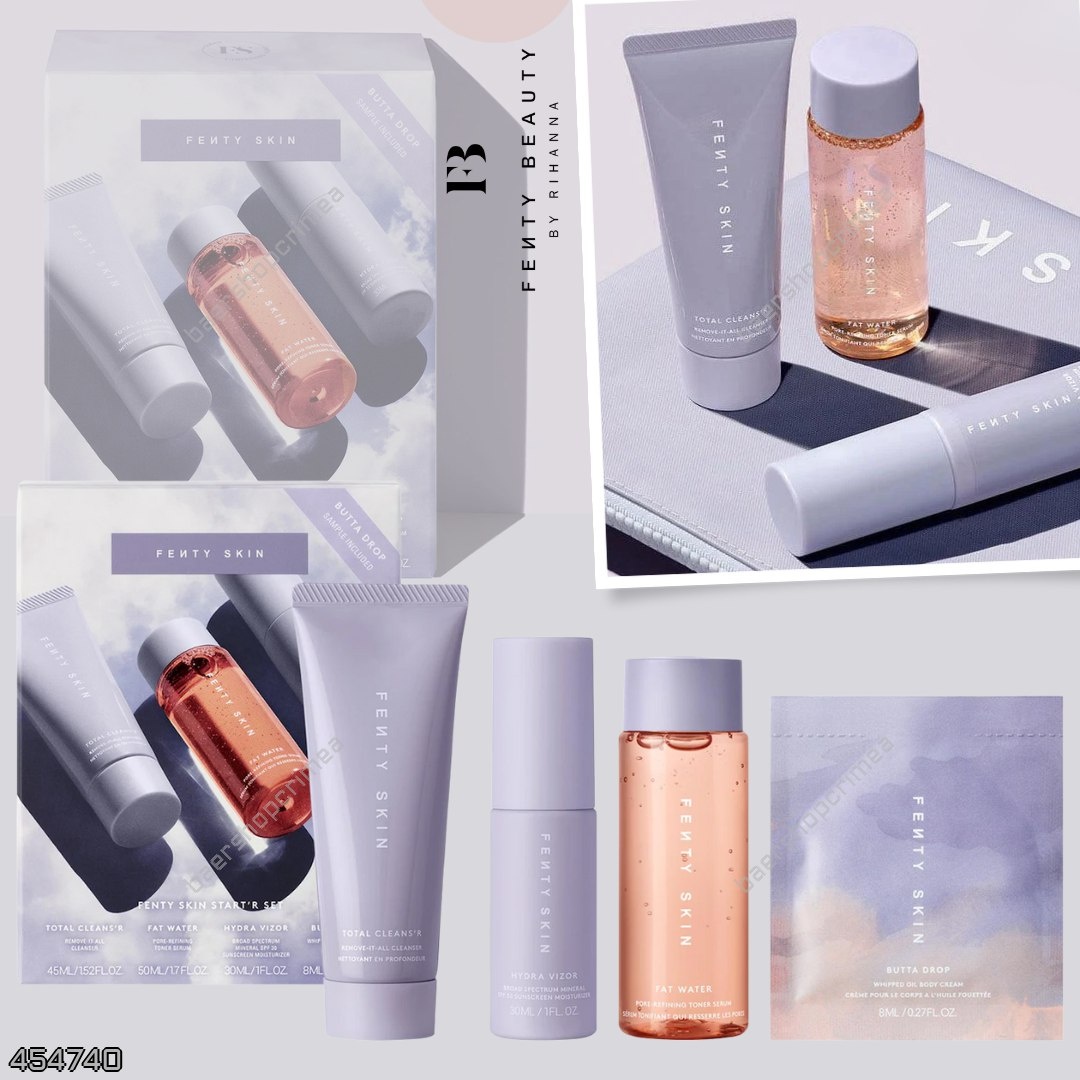#Fenty_Beauty 🇺🇸 Набор для ухода за кожей в тревел-версии (женский раздел) 5382₽ + вес — 45 мл очищающего средства для снятия макияжа Total Cleans’r Mini с экстрактом барбадосской вишни; — 50 мл тоника-сыворотки для сужения пор Fat Water Mini с ниацинамидом и экстрактом барбадосской вишни; — 30 мл солнцезащитного увлажняющего крема Hydra Vizor с минеральными фильтрами широкого спектра действия SPF 30; — 8 мл крема для тела Butta Drop со взбитыми тропическими маслами и баттерами. ID: 454740 для заказа писать - ♥️@dianabrill
