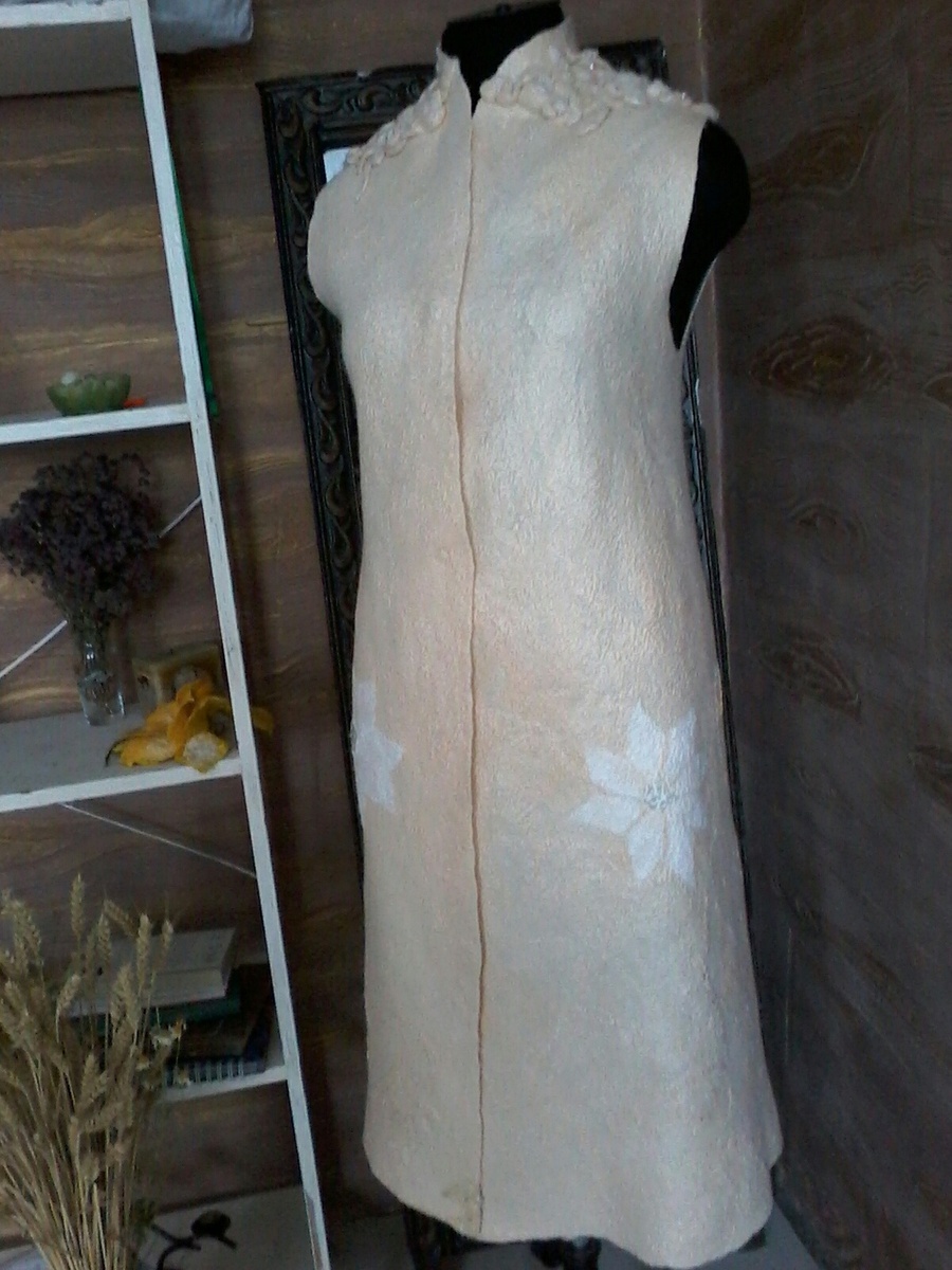 🌟 Эксклюзивный валяный жилет: роскошь мериноса и изящество шёлка 🌟 Представляем вам уникальное изделие ручной работы — валяный жилет, который сочетает в себе благородство материалов и утончённость дизайна! 🧥 ✨ Особенности изделия: · Основа: маргиланский шёлк — изысканная ткань с богатой историей, придающая изделию лёгкость и благородную фактуру. · Основной материал: шерсть мериноса (19 микрон) — ультратонкая, мягкая и гипоаллергенная. Такая шерсть обеспечивает непревзойдённый комфорт и терморегуляцию. · Декор: украшен шёлковыми волокнами, которые создают эффектный акцент и подчёркивают эксклюзивность изделия. · Техника: нунофелтинг (валяние шерсти на шёлковой основе) — позволяет добиться сочетания гладкой поверхности шерсти и интересного «букле»-эффекта со стороны шёлка. · Крой: лаконичный, подчёркивающий фигуру, с застёжкой по центру. Детали: изящная отделка в области горловины, объёмные цветочные аппликации из шерсти 🎨 Почему этот жилет особенный? · Эксклюзивность: благодаря ручн