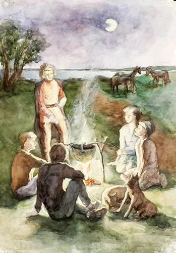 Летний рассвет Уже более трех часов прошло с тех пор, как я присоединился к мальчикам. Месяц взошел, наконец; я его не тотчас заметил: так он был мал и узок. Эта безлунная ночь, казалось, была все так же великолепна, как и прежде. Но уже склонились к темному краю земли многие звезды, еще недавно высоко стоявшие на небе. Все совершенно затихло кругом, как обыкновенно затихает все только к утру. Всё спало крепким, неподвижным, предрассветным сном. В воздухе как будто разливалась сырость. Разговор мальчиков угасал вместе с огнями. Собаки тоже дремали; лошади лежали, понурив головы. Сладкая дремота напала на меня… Свежая струя пробежала по моему лицу. Я открыл глаза: утро начиналось. Еще нигде не румянилась заря, но уже забелелось на востоке. Все стало видно, хотя смутно. Бледно-серое небо светлело, холодело, синело; звезды то мигали слабым светом, то исчезали. Лёгкий ветерок уже пошел бродить и порхать над землею. Я проворно встал и подошёл к мальчикам. Они все спали как убитые вокруг ко