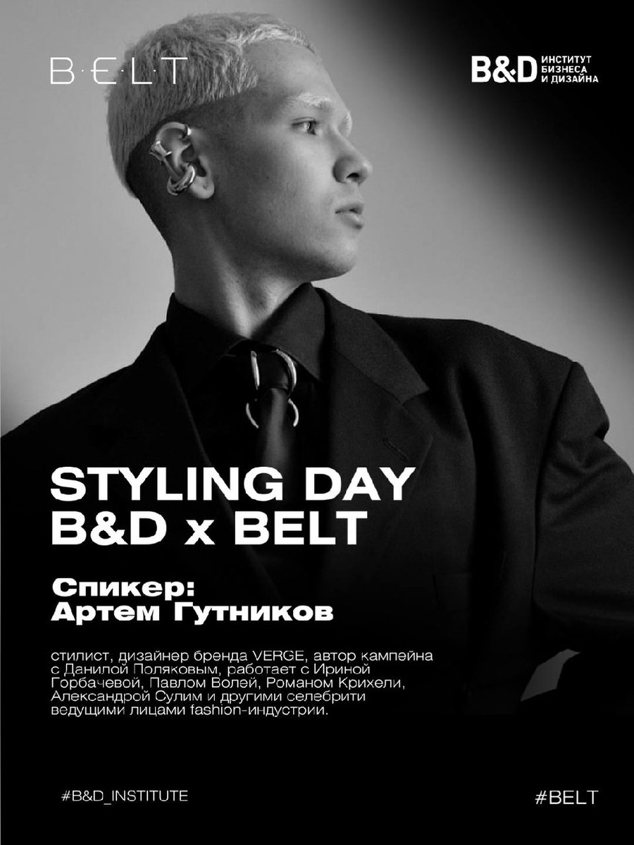ЗНАКОМСТВО СО СПИКЕРАМИ STYLING DAY B&D x BELT Знакомим вас с финальным спикером нашего совместного мероприятия с Институтом бизнеса и дизайна B&D, которое состоится уже в эту субботу 8 ноября в 14:00! Дизайнер бренда VERGE Артем Гутников выступит с лекцией на тему: «Как сделать так, чтобы все поняли что вы сняли?» Артем Гутников — стилист, дизайнер бренда VERGE, автор кампейна с Данилой Поляковым, работает с Ириной Горбачевой, Павлом Волей, Романом Крихели, Александрой Сулим и другими селебрити, ведущими лицами fashion-индустрии. Его бренд VERGE включен в «список марок с большим будущим» по версии The Blueprint. На лекции мы разберемся какие съемки нужны вашему бренду, раскроем секреты создания контента, который не только понятен аудитории, но и эффективно продает вещи. Также научимся определять баланс между креативом и ясностью послания и правильно использовать стайлинг для максимального усиления продаж. ‼️РЕГИСТРАЦИЯ НА МЕРОПРИЯТИЕ‼️ (количество мест ограничено) ____ Дата: 8 н
