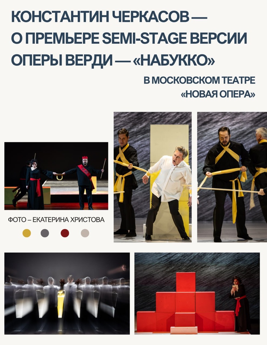 3 октября в московском театре «Новая Опера» открыли юбилейный 35-й сезон, посвятив своему создателю, «неистовому маэстро» Евгению Колобову, премьеру semi-stage версии одной из наиболее значительных ранних опер Верди — «Набукко» (1842). На ней побывал Константин Черкасов: