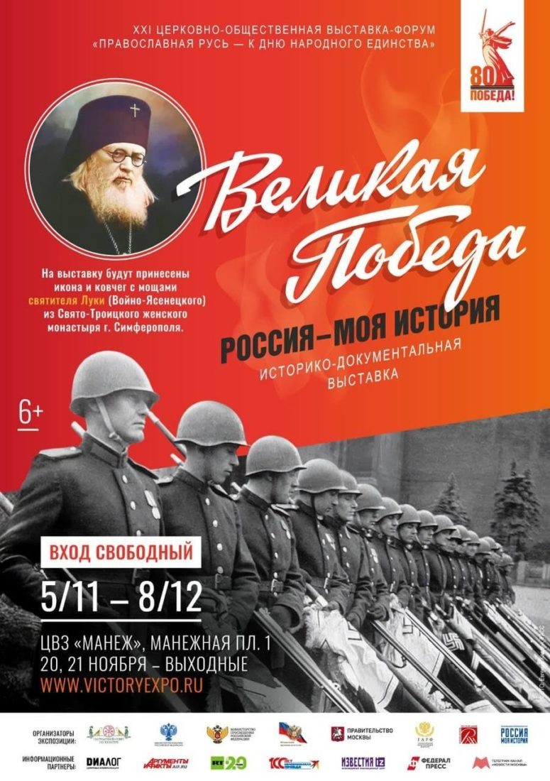 4 ноября — 8 декабря 2025 года в Центральном выставочном зале «Манеж» в Москве в рамках XXI Церковно-общественной выставки-форума «Православная Русь — к Дню народного единства» Патриарший совет по культуре совместно с Федеральным архивным агентством, Государственным архивом Российской Федерации реализует историко-документальный выставочный проект «Великая Победа. Россия — моя история», завершающий год празднования 80-летия Победы в Великой Отечественной войне. 5 ноября в ЦВЗ «Манеж» на время проведения выставки-форума из симферопольского Свято-Троицкого женского монастыря будут принесены икона святителя и исповедника Луки (Войно-Ясенецкого), архиепископа Крымского, и ковчег с его честными мощами. Выставка охватывает период от вторжения войск нацистской Германии и ее сателлитов в пределы СССР 22 июня 1941 года до подписания Акта о капитуляции Японии 2 сентября 1945 года, который официально завершил Вторую мировую войну. В экспозиции представлено более 700 экспонатов. Это уникальные архи