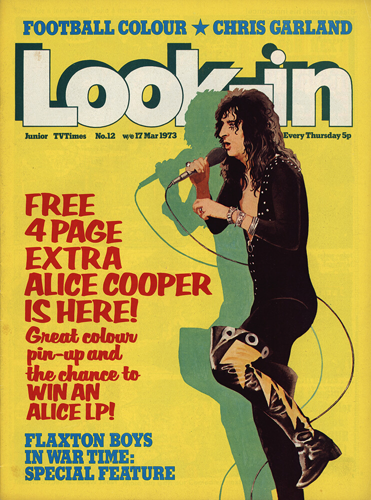 Look-In. 17 марта 1973. #12 Возможно, он не самый великий, но он точно самый дикий! Школа хард-рока и поп-музыки породила немало довольно безумных персонажей, но Элис Купер выделяется как самый странный из них. Ему до реальности, как до Луны! Алиса в Стране Чудес «Всё чудесатее и чудесатее!» Вероятно, вы помните, что именно так выразилась Алиса Льюиса Кэрролла о причудливой Стране Чудес, в которой она оказалась. Но ничто в знаменитой книге Кэрролла не сравнится с историей Элиса Купера. И, как и все хорошие истории, она начинается... Жил-был мальчик по имени Винс в Фениксе, штат Аризона, США. Как и многие дети в начале шестидесятых Винс и его друзья были поклонниками рока, поэтому неудивительно, что они решили создать собственную группу. И неудивительно, что, казалось, не хотел слушать их музыку. В конце концов, вокруг было слишком много групп, и все звучали примерно одинаково. Итак, THE SPIDERS – в те времена их названия включали еще HUSKY BABIES и THE NAZZ – решили, что им нужна какая