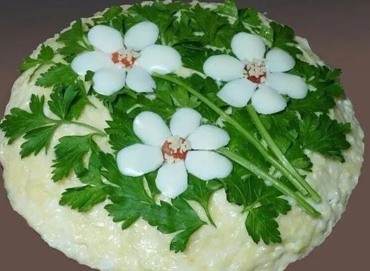 Я решила, что в таком виде салат выглядит слегка скучно, поэтому решила его немного украсить. Создала цветочные композиции из тонких ломтиков яйца и нежных веточек петрушки. По моему мнению, такой декор не только украшает блюдо, но и подчеркнет его свежесть.