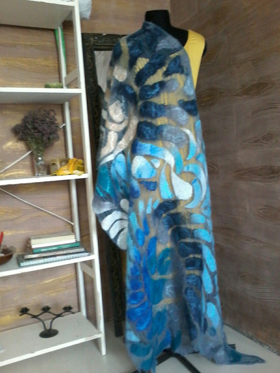 · Эксклюзивный дизайн: абстрактный узор в сине-голубых и бежевых тонах — такой аксессуар точно не оставит равнодушным! · Натуральные материалы: выполнен из качественного войлока (овечья шерсть) — мягкий, приятный к телу и невероятно тёплый. · Универсальность: подойдёт как для повседневных образов, так и для особых случаев. Легко сочетается с пальто, тренчами, платьями. · Идеальная драпировка: прямоугольная форма и особая фактура материала позволяют красиво уложить палантин на плечах. · Экологичность: полностью натуральный состав — забота о природе и вашем здоровье. 🎨 Почему стоит выбрать именно этот палантин? · Ручная работа — каждая деталь продумана до мелочей. · Уникальность: благодаря особенностям валяния, двух абсолютно одинаковых палантинов не бывает! · Долговечность: при правильном уходе изделие прослужит много лет. · Элегантность: добавит шарма и утончённости любому образу. 💡 С чем носить? · С классическим пальто для делового образа. · С джинсами и свитером — для расслабленног