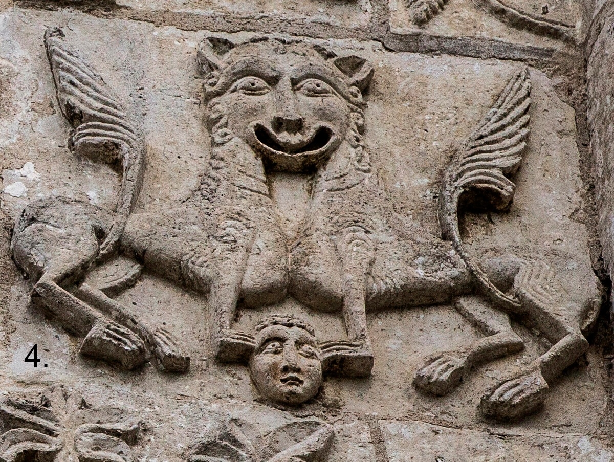 Самый часто встречающийся сюжет соборов- это лев( рис 9.) по большей части улыбающийся и лишь в одном месте ему разрывают пасть( рис.5). И, как ни странно, улыбаться он начинает после смерти. Стоит объяснить. Художник разговаривает с нами аллегорически и образами пытается передать смысл сюжета. Лев- это эго человека, а его задача (не всех, а готовых к этому духовных искателей,подвижников) убить эго и тогда они обретут божественное качество( самдхи, нирвана ) Но не будем забегать вперед, зафиксируем- что бы получить улыбающегося льва(дружественное эго), нужно сперва его убить, принести свою личность в жертву Господу.(инструкция для убийства льва- вся религиозно- философская литература, все религии по- рзному говорят об этом и нет лучшей смерти чем "за други своя" у славян)