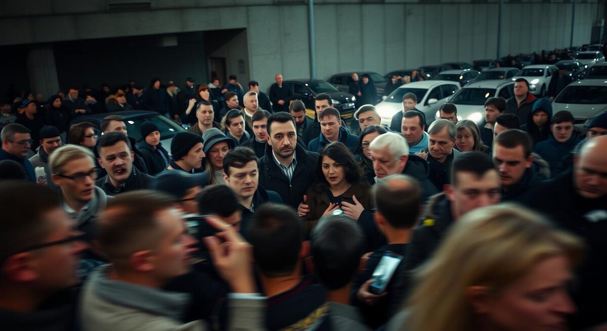 «Мы больше не можем молчать: это наш двор, наш подъезд, а нас просто оттолкнули!» — кричит пожилая женщина, прижимая к груди связку ключей и показывая на тесную парковку, где машины стоят бампер к бамперу, а люди толкаются плечами, спорят, снимают на телефоны и нервно гудят.