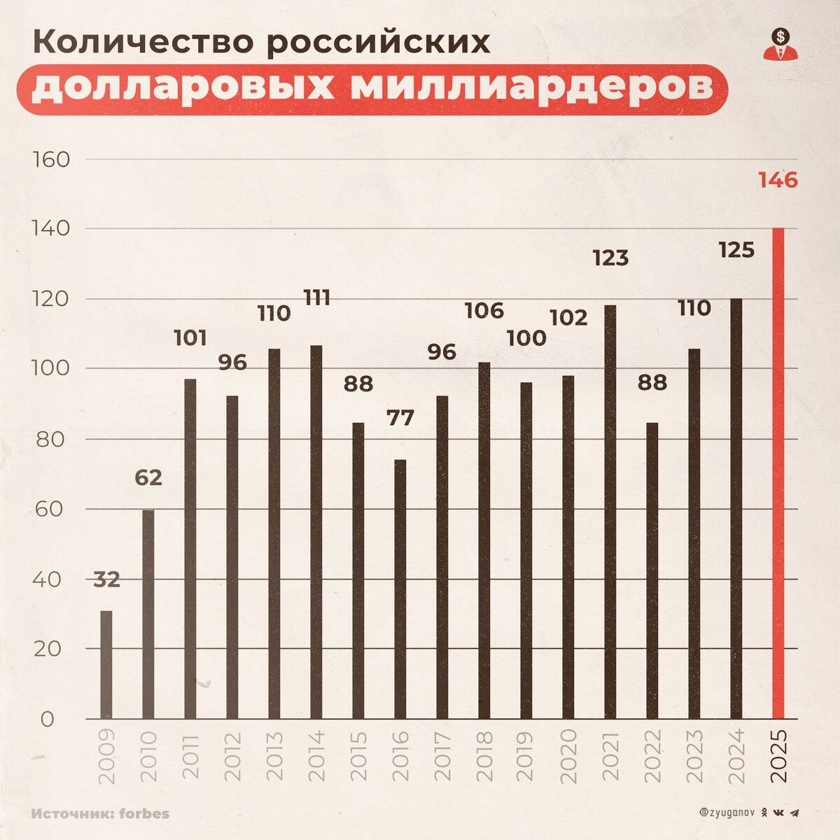 Согласно данным Forbes, в 2025 году долларовых миллиардеров в России стало аж 146 человек. Это исторический рекорд. А точнее - антирекорд. Их совокупное состояние раздулось до $625,5 млрд.