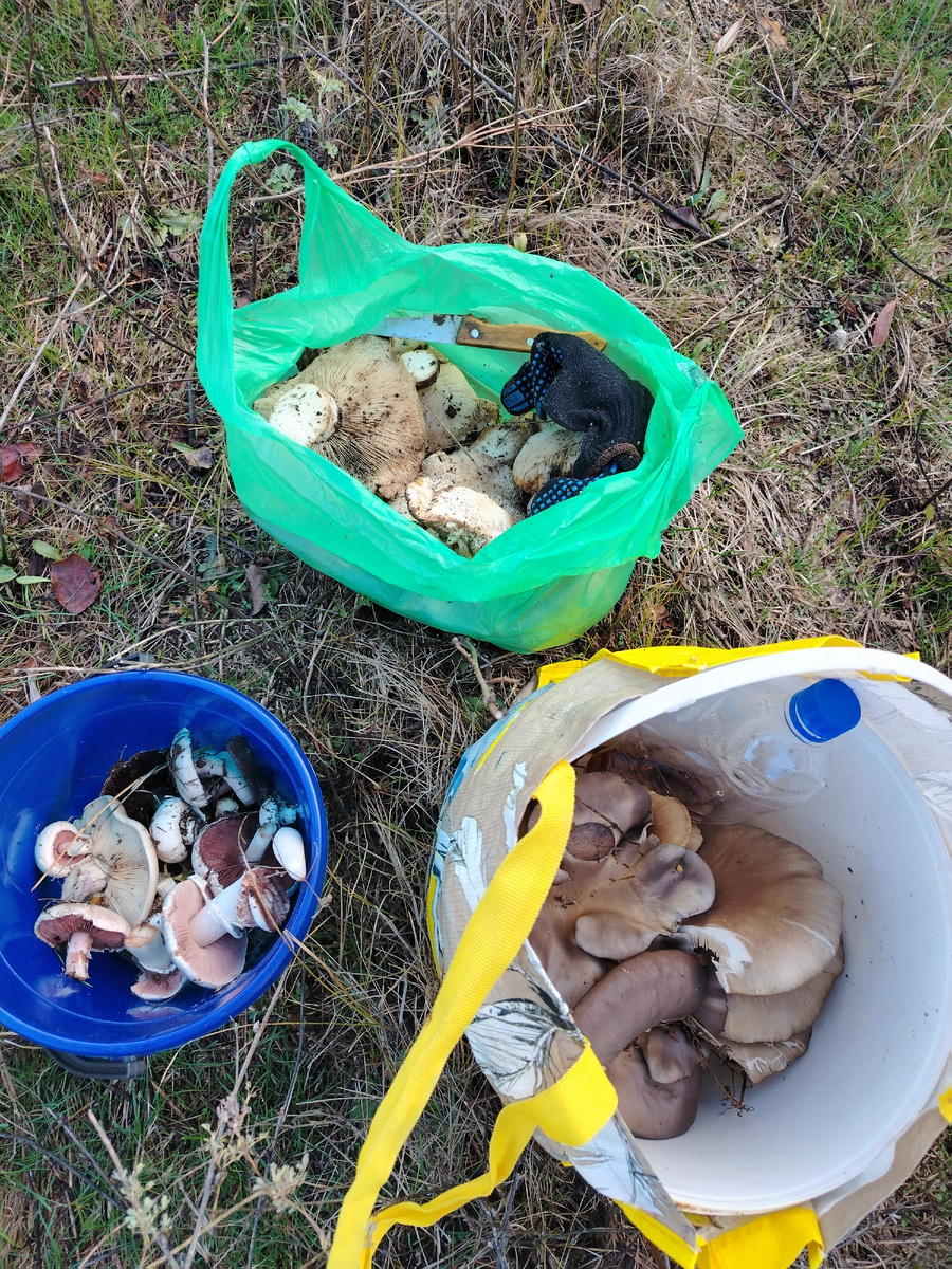 В Средней полосе России с грибами уже прощаются, а у нас, на юге, грибы только начинаются! За последние две недели наконец-то прошли хорошие дожди (первый за осень), и мы начали пожинать плоды. Поездка в лес 3 ноября была хаотичной, я собиралась только прогуляться по "знаковым" местам. Как только зашла в свой лесок, так сразу меня встретили шампиньоны, прямо посреди грунтовой дороги. Набрала с полведерка и пошла дальше. Разочаровала тополевая рядовка. Где неделю назад с супругом собрали большое ведро, от рядовки не осталось и следа... На этом месте отходит... Очень жаль! Добралась до заветных вешенковых пеньков. Но и там почти пусто! Крошечный букетик только начал расти, и хороших "всходов" ждать еще минимум неделю. Заглянула в терн, и там удача! Несколько синеножек! Они только набирают рост, поэтому отсюда вывод - через денек-другой надо еще раз проверить это место! Покружив с часок в своих посадках, отправилась на новые места. И тут снова удача! Сначала шикарная дорожка тополевк