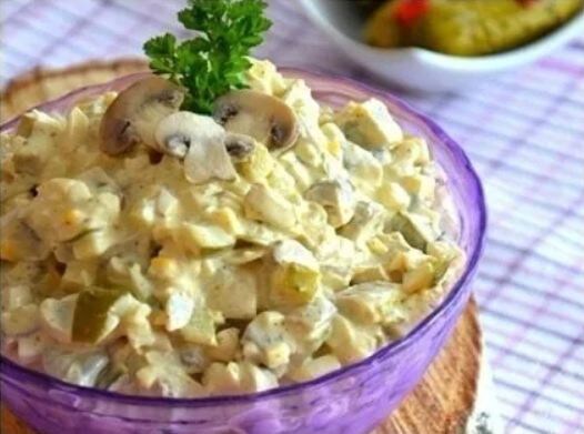 Этот удивительный салат сочетает в себе глубину вкуса жареных грибов, пикантность соленых огурцов и нежность сырной ноты. Каждый ингредиент вносит свою уникальную партию в эту вкусовую симфонию, создавая блюдо, которое станет украшением любого стола. Ингредиенты: