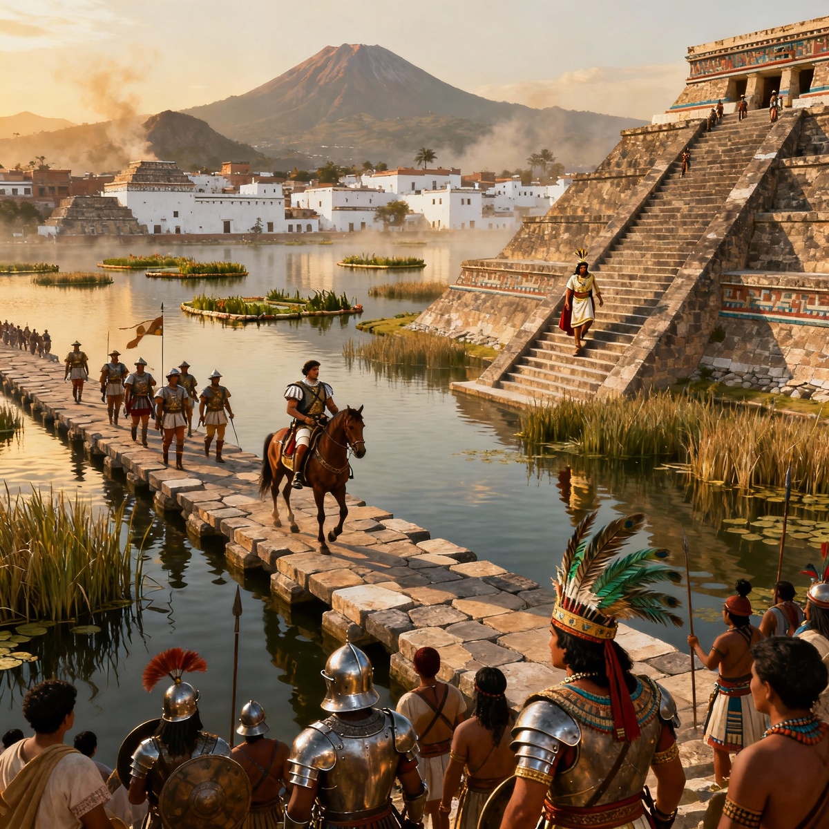 8 ноября 1519 года испанский конкистадор Эрнан Кортес с отрядом из 500 человек вошел в Теночтитлан — величественную столицу ацтеков, сияющую пирамидами и каналами. Император Монтесума II, правитель империи, ждал их не как врагов, а как посланцев богов. Согласно древним легендам, в этот год должен был вернуться Кетцалькоатль, пернатый змей, белобородый бог с Востока, изгнанный своими же жрецами. Монтесума вышел навстречу в золотых одеждах, окруженный свитой из тысяч воинов. Он приветствовал Кортеса цветами и речами: «Ты — наш господин, вернувшийся, как предсказано». Испанцы ступили на дамбу, ведущую к городу, где их ждали пиры и дары — золотые маски, перья кетцаля, жемчуг. Но в воздухе витал страх: жрецы шептали о знамениях, а Монтесума дрожал, словно перед концом света. Годом раньше небо пылало: столб огня висел над озером, молнии били в храмы Теночтитлана, комета прорезала небо. Женщина-призрак, Сихуакоатль, стонала по ночам: «Бегите из города!». Рыбаки поймали птицу с зеркалом на го