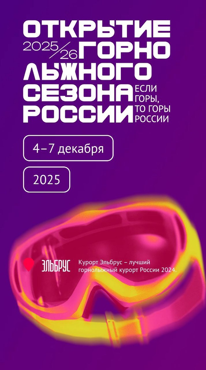 🎉 Горнолыжный сезон открыт! 🏔️ 4–7 декабря легендарный Эльбрус станет главной точкой притяжения для всех любителей зимы.Присоединяйся к грандиозному фестивалю! Что ждет гостей: 🚡 4 локации: от поляны Азау до ледника Гарабаши (4000 м). 🏆Фестиваль курортов: вся Россия на одной горе! 💪Зарядка со звездами со спортсменами и медийными лицами. 🛍️Ярмарка и тест-драйвы новейшего снаряжения от топ-брендов. 🔥Зрелищное фрирайд-шоу на высоте. 🍷Уютные апрес-ски зоны на «Кругозоре» и «Мире» с потрясающими видами. 🎵Живая музыка, фудтраки и главная сцена на парковке с вечерними концертами. Готовься к зиме вместе с нами! Всё самое интересное уже здесь ❄️ Подробности и программа на официальном сайте: 👉https://открытиегорыроссии.рф #Эльбрус #ГорнолыжныйСезон #ОткрытиеСезона #ТуризмКБР