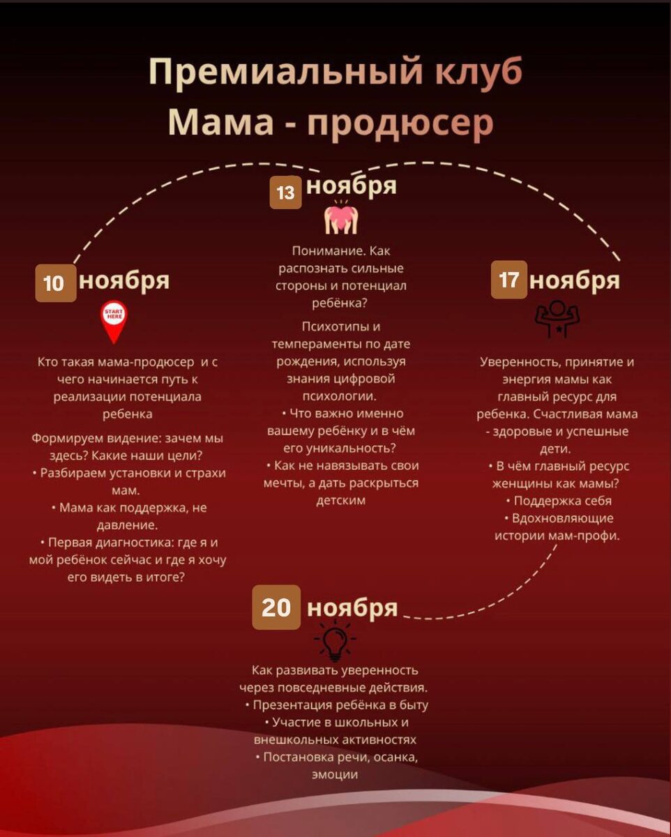 🔱 Премиальный клуб «МАМА-ПРОДЮСЕР» 🔱 ❓О чём это❓ Это пространство для осознанных мам, которые хотят не просто «воспитывать», а создавать системный фундамент для жизни своего ребёнка - эмоциональный, интеллектуальный и социальный. Мама здесь как продюсер: она видит потенциал, помогает ему проявиться, создаёт среду, где ребёнок растёт в уверенности, любви и самореализации. Миссия клуба⚜️ Помочь маме стать стратегом развития своего ребёнка, сохранив при этом внутренний баланс и энергию. Ведь ресурсная мама = сильный фундамент семьи 🪄 Что даёт клуб: • 🔹 Осознание своей роли как “первого продюсера” ребёнка - создателя его будущих привычек, мышления, самооценки. • 🔹 Практики по развитию эмоционального интеллекта, мягкому лидерству и потенциалу. • 🔹 Наставничество и поддержка других мам, идущих по пути осознанного родительства. • 🔹 Инструменты планирования развития ребёнка по ключевым сферам - мышление, характер, коммуникация, таланты. 🔅Ключевая идея Ребёнок как проект, но не в