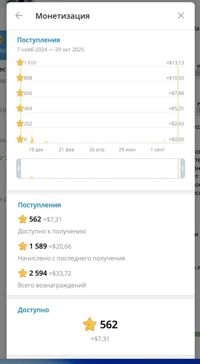 Если вам вдруг интересно, сколько можно заработать на донатах в канале Телеграм, то вот - на картинке моя статистика
