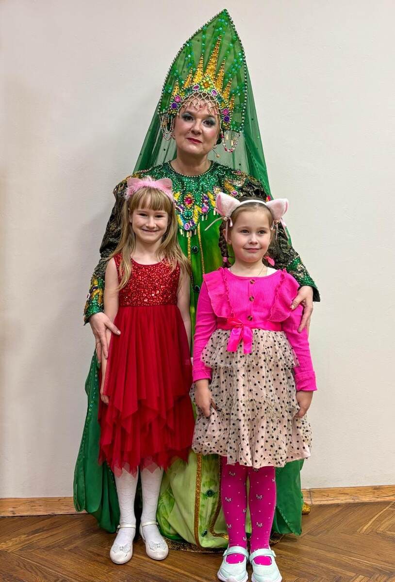 После спектакля "Каменный цветок (Хозяйка Медной горы)". Юные (и не очень) театралы с артистами спектакля Александрой Норец (Хозяйка Медной горы), Борисом Батуевым (Мастер Прокопыч), Беатой Маковской (Барыня Матильда Францевна).