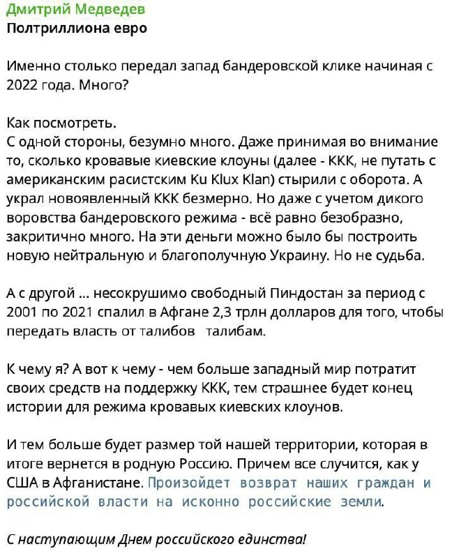 Западные траты на Украину приведут к тому же результату, что и в Афганистане, считает Медведев. Зампредседателя Совбеза России Дмитрий Медведев заявил, что масштабные финансовые вливания Запада в Украину, по его мнению, приведут к аналогичному афганскому сценарию. Он напомнил, что США потратили в Афганистане $2,3 трлн, но в итоге власть в стране вернулась к "Талибану". Медведев выразил уверенность, что чем больше Запад будет тратить на поддержку Киева, тем больше территорий в итоге перейдет под контроль России. 📍Подписывайтесь на Инфо24 | Прислать новость