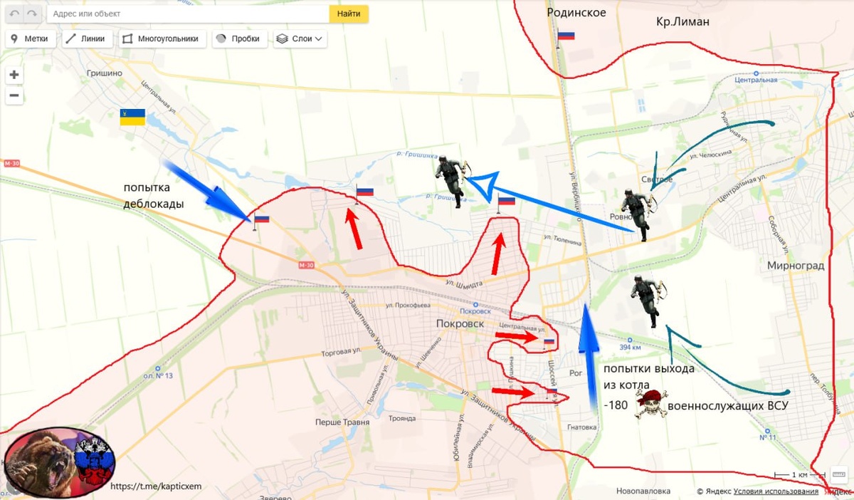 В ответ на пост Красноармейский котел или Мирноградская давильня В конце июля, начале августа ВС РФ подготовили фронтальный вариант штурма Мирнограда. Генштаб Украины парировал угрозу, сконцентрировав тут пару бригад по окраинам. Но наш Генштаб в очередной раз переиграл оппонента. Была применена тактика не фронтального штурма, а фронтального выдавливания из Мирнограда, и не в августе, а в октябре-ноябре - этакий давильный пресс. Разрозненные подразделения ВСУ откатываются в "долину смерти" между северным Покровском и южным Родинским, попадая под перекрестный фланговый или косоприцельный кинжальный огонь. Аминь. схемы и карты