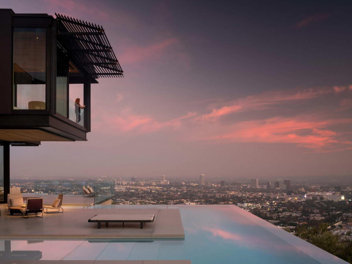 Этот высокотехнологичный дом в Западном Голливуде расположен чуть выше Сансет-Стрип, из него открывается вид на Лос-Анджелес, простираясь от гор Сан-Габриэль до Тихого океана. Этот «большой вид» со всеми его разнообразными особенностями в зависимости от времени суток и климата был ключевым двигателем архитектуры и дизайна этой виллы. Клиент хотел, чтобы дом казался ему и его многочисленным гостям приключением, когда вы проходите через 1450 квадратных метров на трёх уровнях. Этот дом перемещается во многих различных масштабах: больший ландшафтный масштаб Лос-Анджелеса, масштаб развлечений и больших групповых встреч, а также интимный масштаб пространств для повседневной жизни. Меня больше всего волнует, как дизайн переплетается между этими масштабами и позволяет клиенту расширять или сжимать дом в зависимости от меняющихся потребностей (Том Кундиг). Граница между внутренним и внешним миром практически растворяется в жилых помещениях, которые полностью открываются почти на 650 квадратных