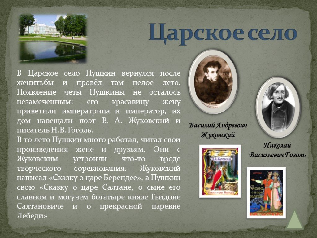 - Парки, пруды, аллеи Царского Села — первые «натуры» пушкинской лирики: