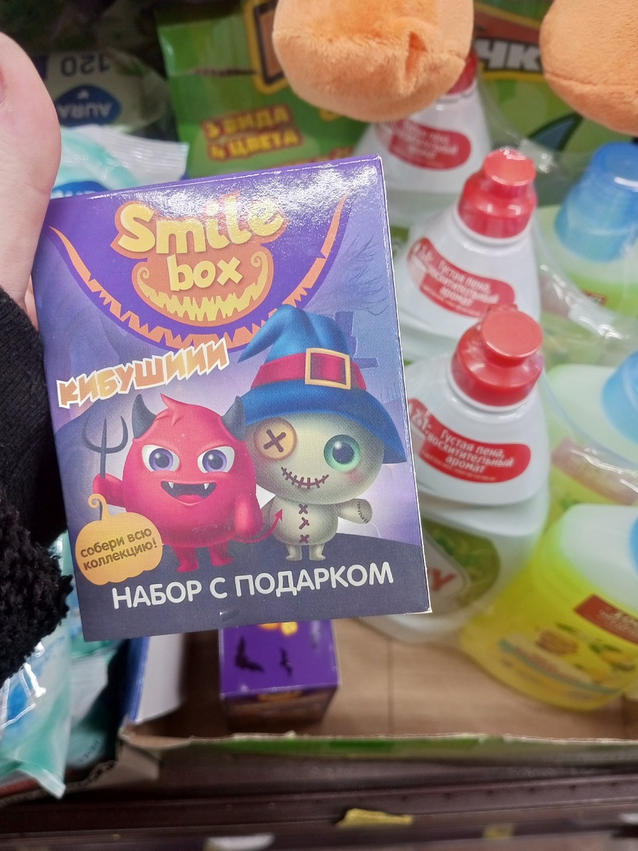 Все не могу привыкнуть к тому, что в "Красное&Белое" раз в какое-то время появляется новинка, из-за которой у меня буквально со всех сторон в соц.сетях появляются распаковки и отзывы об этой покупке, но как человек, который тоже любит все популярное, я обычно сразу иду ее искать. В этот раз мне постоянно попадаются восторженные отзывы о фигурках из эпоксидной смолы, они стоят буквально 40 рублей, но раскупают их крайне быстро - никакой функции, кроме декоративной, они не несут. И что вы думаете? У нас в городе их уже нет, хотя я буквально вчера узнала о том, что они в принципе появились в ассортименте. А для того, чтобы не уходить с пустыми руками, я решила просто посмотреть хоть на что-то другое, в этом магазине практически всегда есть некоторые обновления. Ассортимент уже довольно широкий, но давайте обсудим найденные в этот раз продукты: Из игрушек нашла только такие наборы, причем они, видимо, были приурочены к Хеллоуину. Праздник уже прошел, а вовремя все распродать не получилось,