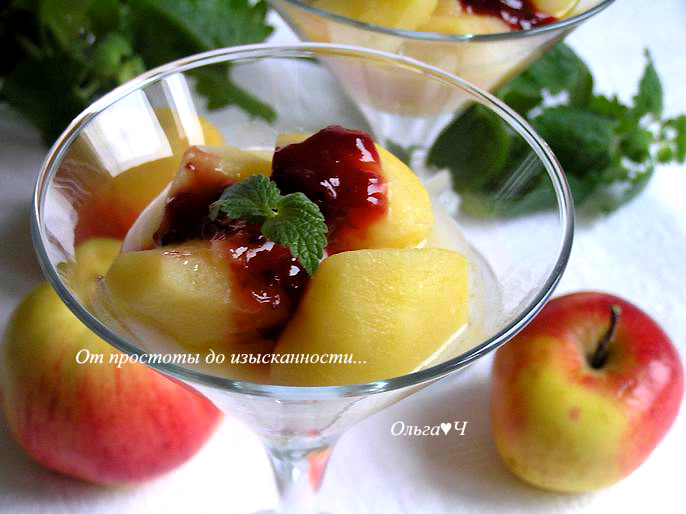мята для украшения Приготовление: Яблоки очистите от кожуры и семян, нарежьте на 4-6 частей, выложите в кастрюльку, влейте немного воды (чтобы покрыть дно кастрюльки), добавьте кусочек сливочного масла. Если яблоки слишком кислые, добавьте немного сахара. Доведите до кипения, готовьте на минимальном огне до мягкости яблок около 7-12 минут (время зависит от сорта яблок). Готовые яблочки немного остудите, разложите по пиалам/креманкам вместе с образовавшимся вкуснейшим соусом. Полейте конфитюром, украсьте мятой и подавайте. Приятного аппетита! Вам также могут понравиться: