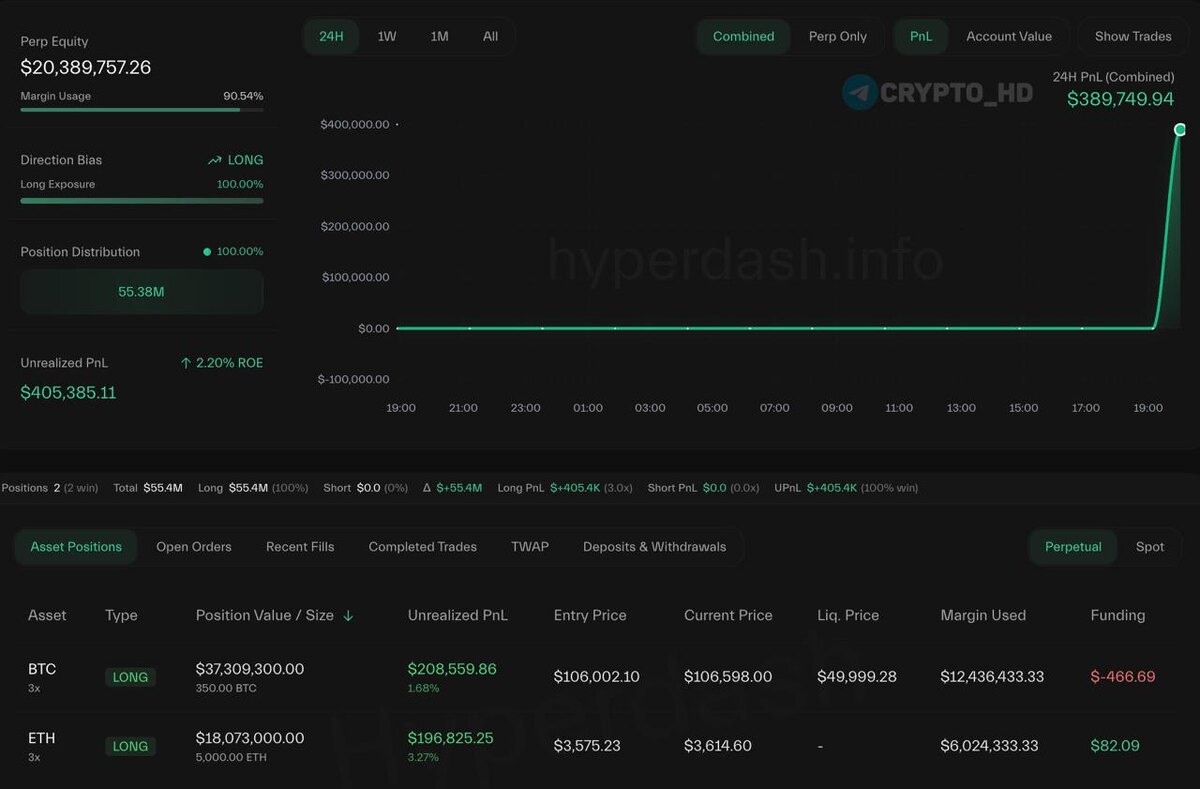 😳 Ранний майнер Bitcoin OG вернулся на Hyperliquid…завел $20,000,000 и открыл лонги по BTC и ETH