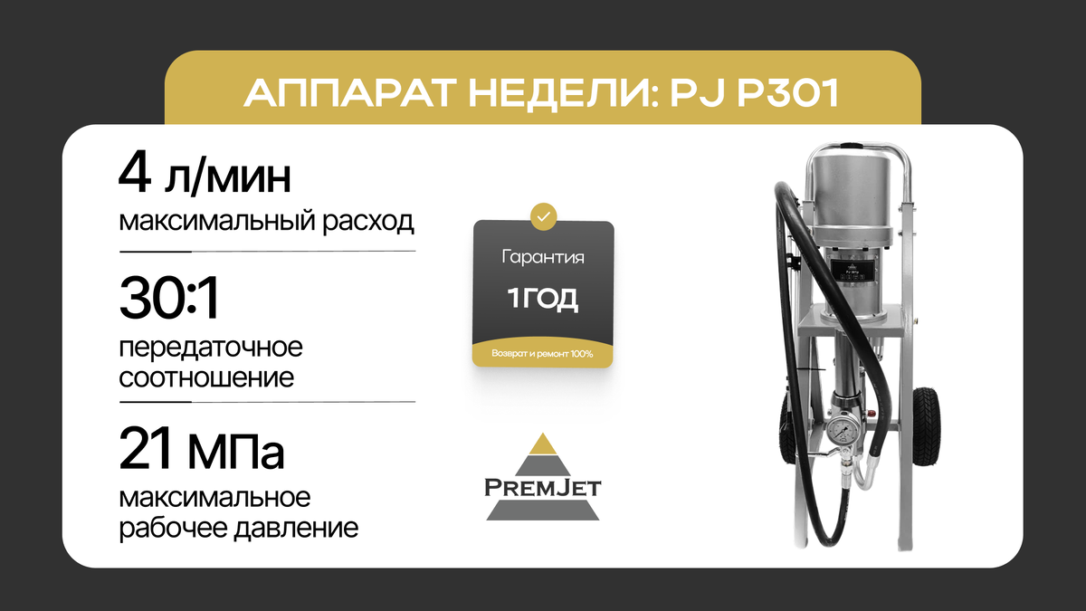 PJ P301 — это пневматический окрасочный аппарат, который уверенно справляется и с красками, и с густыми шпатлёвками Производительность — до 4 л/мин,