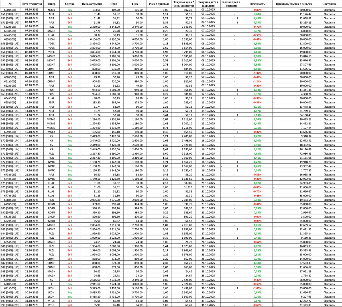 Итоги октября 2025 года: +2,78% за месяц, 43 сделки, 21 прибыльная. Сколько заработал денег на падении?