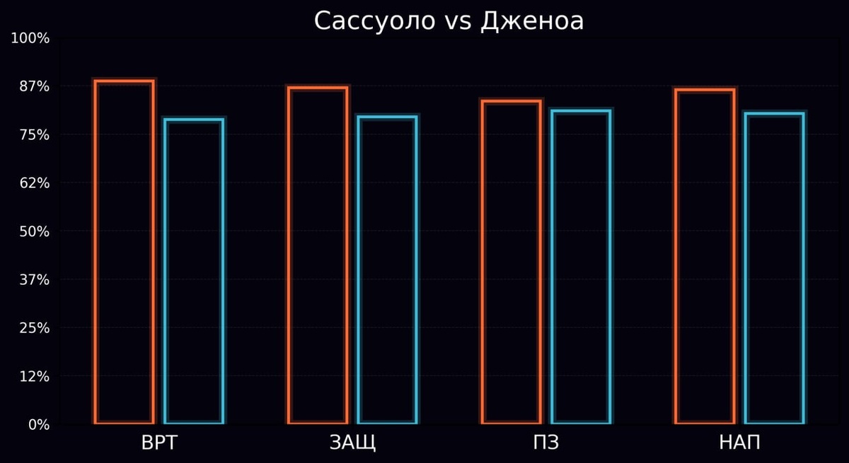 🔥 Сассуоло vs Дженоа ⚔️ Сравнение линий - Защита: 69% vs 63% - Полузащита: 66% vs 64% - Нападение: 69% vs 64% 🔀 Перекрёстное сравнение - Нападение Сассуоло vs Защита Дженоа: 69% vs 63% - Нападение Дженоа vs Защита Сассуоло: 64% vs 69% 🛡 Защитная функция - Сассуоло: 68% - Дженоа: 64% ⚔️ Атакующая функция - Сассуоло: 69% - Дженоа: 63% 📊 xF: 68% / 64% Вероятности исходов: 🏠 Победа хозяев — 30% 🤝 Ничья — 61% 🚩 Победа гостей — 9% ... Такие дела. ML модель склоняется к тому, что хозяева сегодня не проиграют, А вероятнее всего будет ничья. Я бы сказал, что все-таки есть крен в пользу Сассуоло. И xF выше и "улыбка" по тренду SqB. Добавляю также скрин из Data ball club