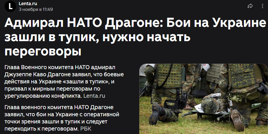Это то, что гласят заголовки: мол, "Адмирал НАТО призывает к перемирию!" Но в реальности же было сказано другое. Итак, взято отсюда: Admiral Giuseppe Cavo Dragone, chair of Nato's military committee since January, added from an operational point of view he considered the Russia-Ukraine war was bogged down, and "it was almost time to sit and talk because it's a waste of lives". Адмирал Джузеппе Каво Драгоне, глава военного комитета НАТО с января нынешнего года, сказал, что с оперативной точки зрения он считает российско-украинскую войну зашедшей в тупик, и "почти что" настало время сесть за стол переговоров, ибо жаль траты человеческих жизней. "Почти что" — это не призыв к переговорам, а призыв потянуть ещё резину, пока Россия не согласится на условия, которые выставил коллективный Запад. Также адмирал сказал следующее: "Мы будем с Украиной до тех пор, пока не наступит мир." То есть он, в принципе, нам говорит, что готовы воевать до последнего украинца, ибо при тотальном коллапсе Украин