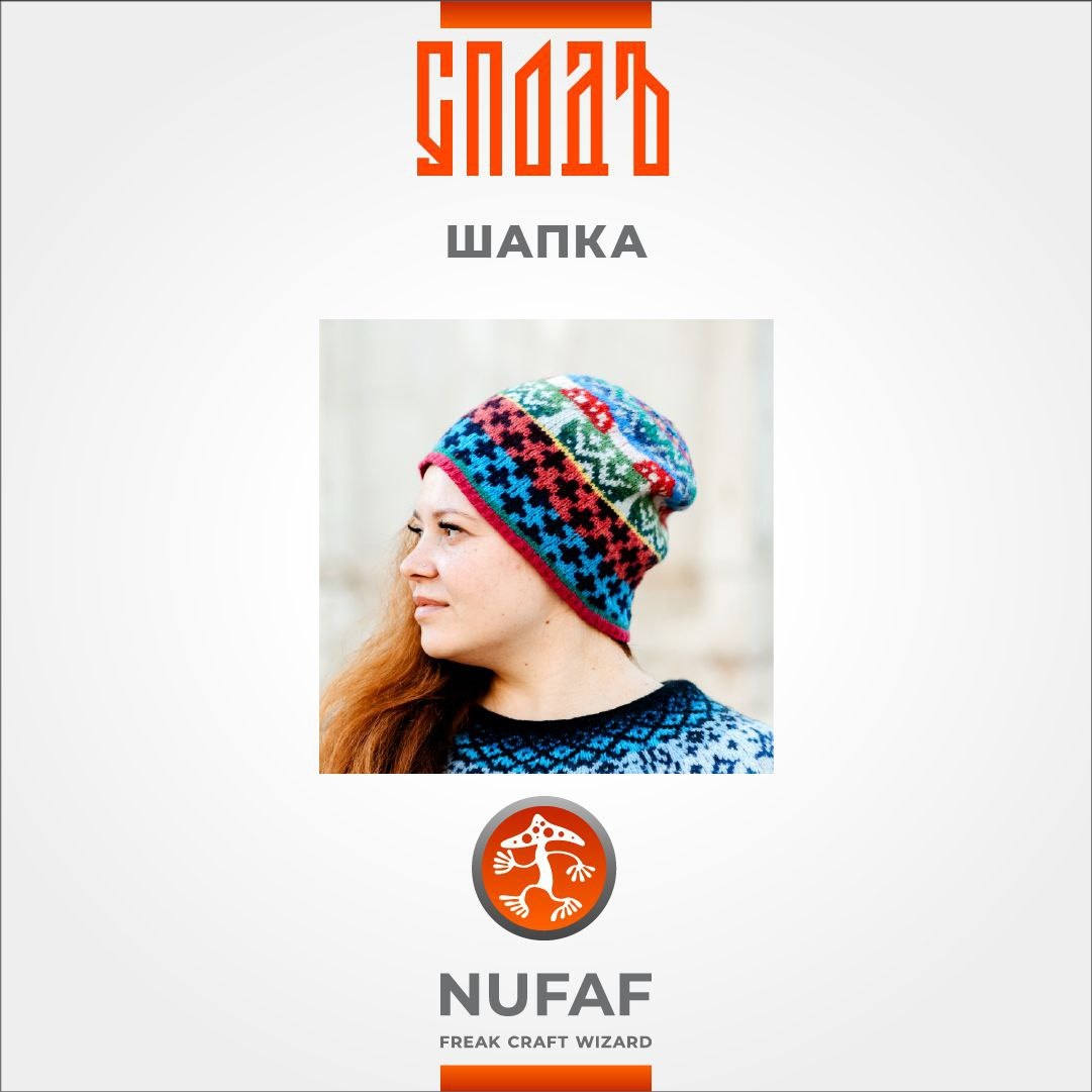 Шапка СПОДЪ это хоровод-круговорот цвета, графического орнамента, загадочных символов и конечно мухоморов пустившихся в пляс вокруг головы.