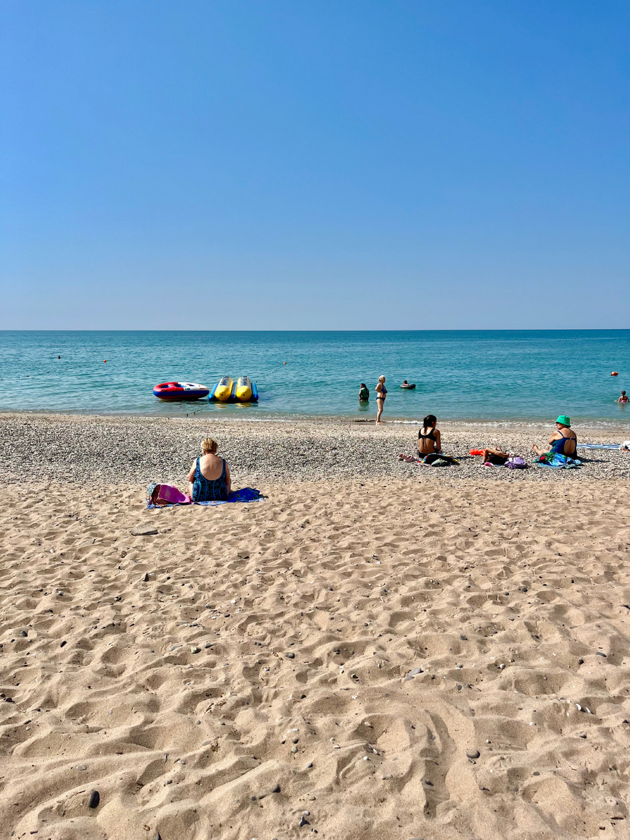 …Прекрасное утро, чистое небо, яркое солнце, желтый флаг чуть развивается. Мы расположились опять под спасательным постом, главное успевать передвигать лежанку, тень очень быстро передвигается, ну или мы очень редко выходим на сушу. Палатка-арбуз все равно с нами на выгуле, хоть её и скривило, но в ней удобно хранить вещи. Видимо при складывании в крепких мужских руках Вовы её погнуло. Палатка, оказалась не наш конек, с зонтом-арбузом мы не расставались шесть лет. В следующем году придется опять его взять). …Вышли мы опять на сушу, а у нас соседи появились. Спасательный пост обрастает коммунальной квартирой. Прямо под ним расположились две женщины, по всем четырем сторонам огородились простынями, и что самое интересное, простыни не простые, а белые и на них печати. Раньше белье опечатывали в больницах, в санаториях. Его видимо или списали или спи…, все просто и без стеснения на всеобщее обозрение)). …Прогулялись вдоль пляжа, посмотрели на творения из песка, мы уже выросли из это