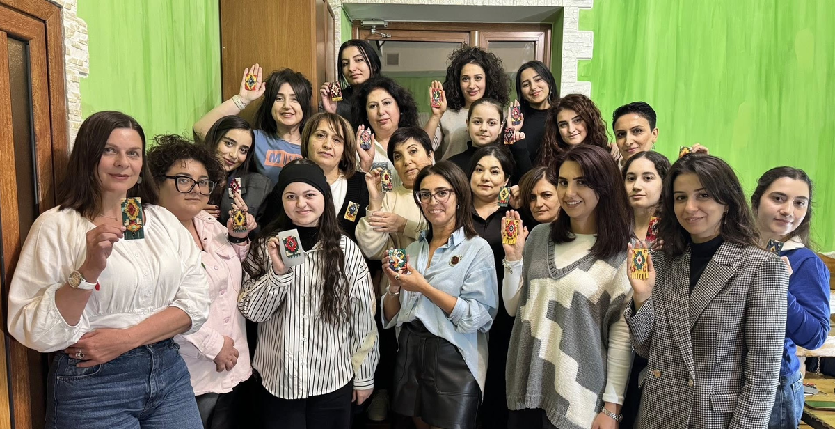В культурном центре «Диалог» на этот раз было особенно оживлённо и многолюдно. Здесь вновь собрались мастерицы из Арцаха, чтобы вместе создавать броши с традиционным ковровым узором. Тёплая атмосфера творчества и общения объединила участников, подарив ощущение настоящего праздника. Организаторами мероприятия выступили культурно-образовательный фонд «Кирс» (QirsProject) и центр «Диалог», уже ставшие постоянными партнёрами в проведении творческих встреч. Мастер-класс вела Марине Агаян, создательница бренда Aghayan Hand Made. Она хорошо знакома участницам по предыдущим занятиям, где они создавали броши в форме граната — символа Армении. В этот раз Марине предложила новую идею — брошку с арцахским ковровым узором, что вызвало живой интерес и вдохновило всех на творчество. Работы выполнялись из кожи и бисера — материалов, требующих внимания и аккуратности. Каждый участник сделал уникальное изделие и, конечно, забрал его с собой. Многие не удержались и тут же прикрепили брошь к одежде, уходя