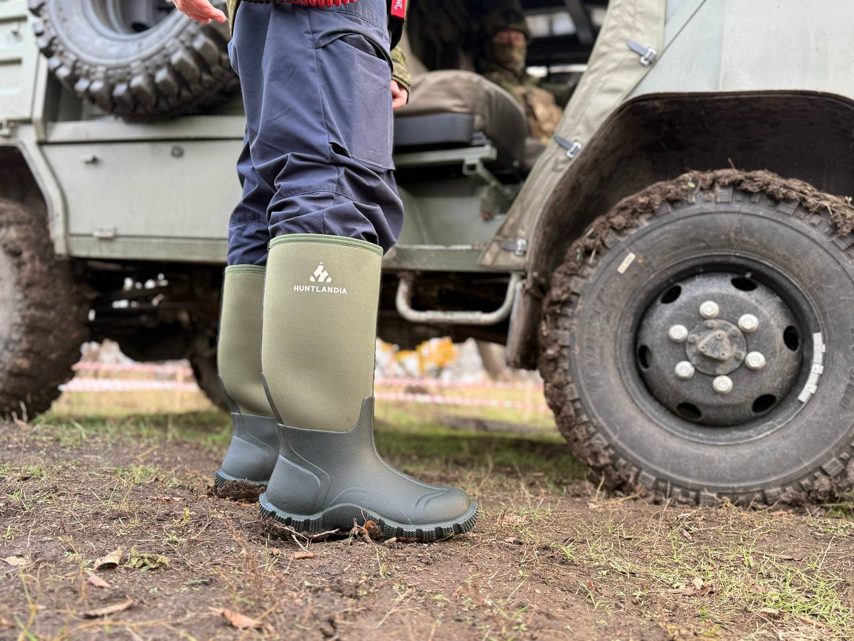 Все кто бродит в межсезонье по размокшим во время ливней полям, и тем более окопам, знает какую проблему представляет собой промокшая обувь. Вода затекает в какой-то момент в ботинки, даже самые лучшие, сверху и через отверстия, грязь забивает мембраны и вообще всё это крайне неприятный процесс. Рано или поздно все пробуют резиновую обувь, но у неё свои проблемы: пот скапливается внутри в отсутствии вентиляции и ноги в них преют, если носить очень долго, то можно сливать воду изнутри. Резиновые подошвы часто бывают скользкими. И главное, что резиновую обувь часто тяжело подобрать под погоду, поскольку от воды она защищает, но не греет как таковая, нужны подкладки, а они в свою очередь собирают влагу... В общем, чаще всего приходится переобуваться где-то из ботинок в сапоги, прыгая на одной ноге в грязи. С другой стороны, технологии на месте не стоят и ситуация меняется, так что я обновил на полигоне сапоги HUNTLANDIA NEO High Green. Ну вы знаете, офицеры которые приезжают на полигоны н