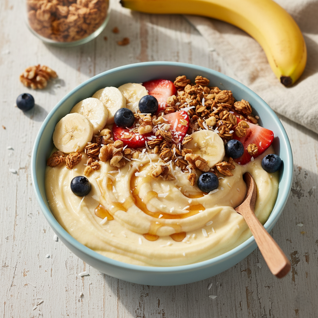 - Свежие ягоды/фрукты: Нарезанный банан, клубника, голубика.
